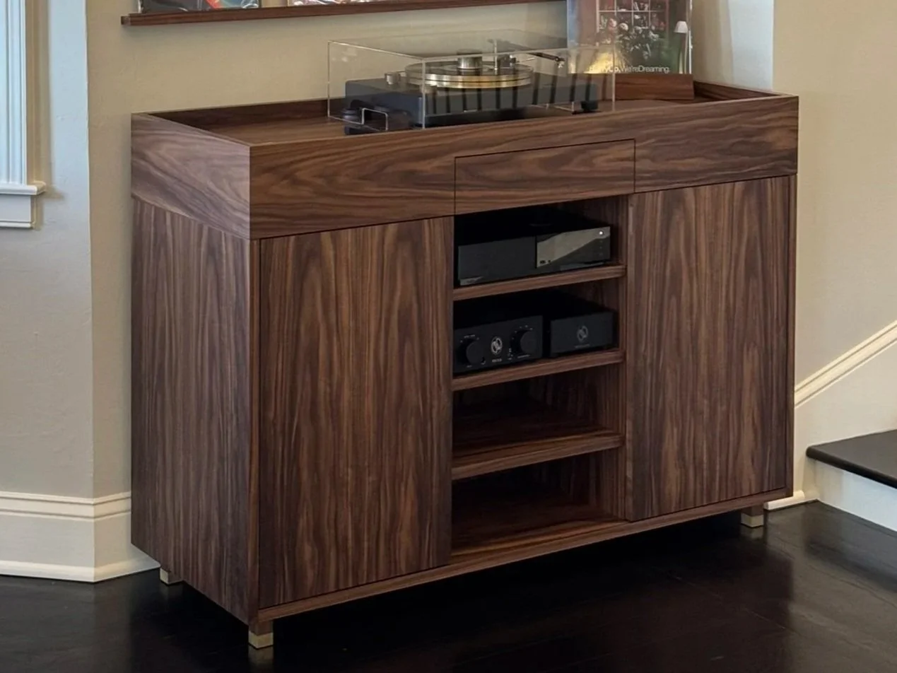 Designed in collaboration with Bailey Reese at JFY Designs, this piece is the home of the most beautiful turn table I’ve seen to date. The rich-colored walnut was selected to blend with the home, but it compliments the bronze of the turn table as well.